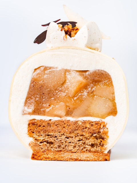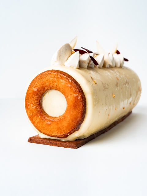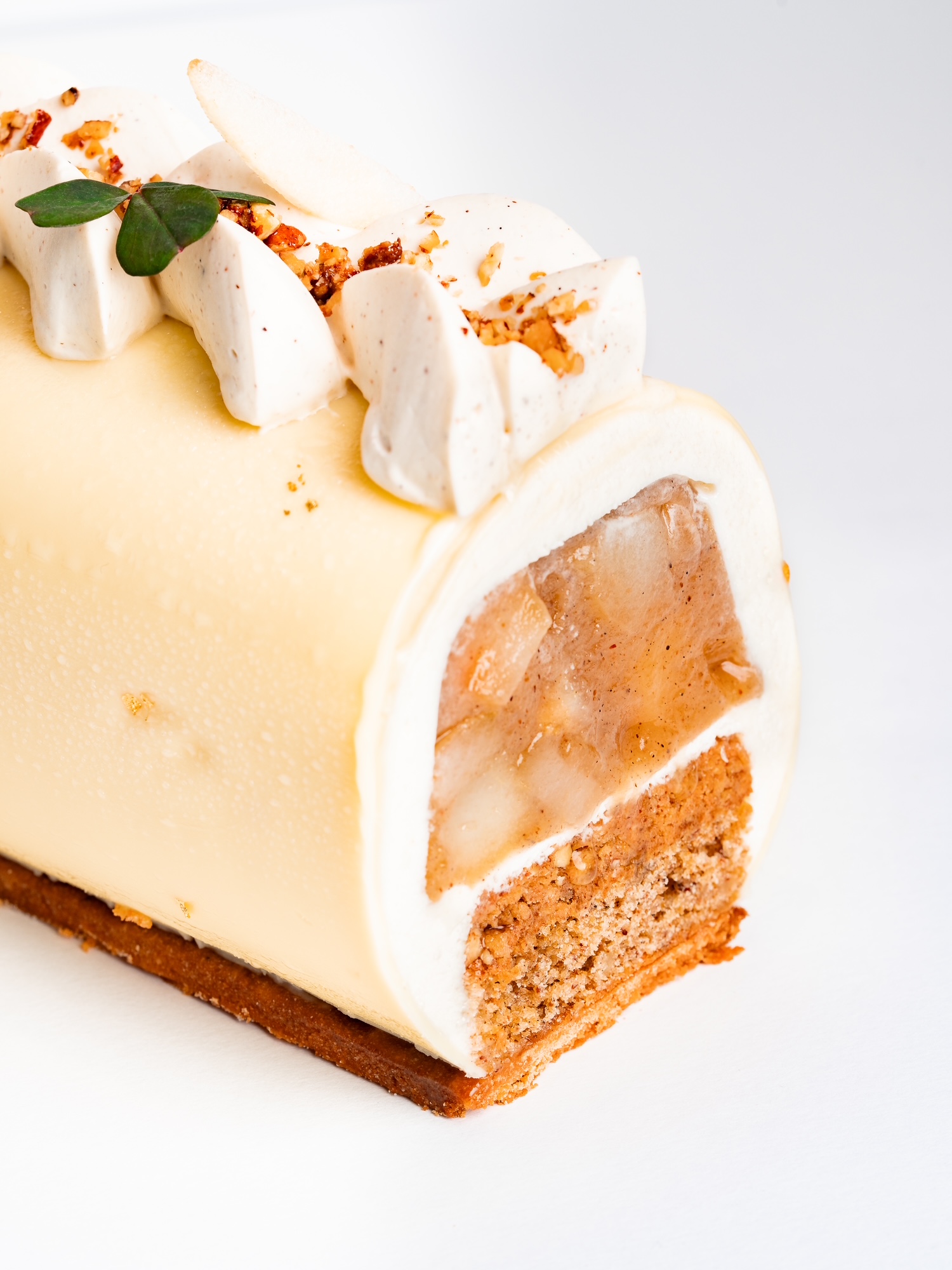 Notre irrésistible Bûche aux saveurs hivernales! Un équilibre parfait... Déposée sur un sablé vanille croquant, appréciez la douceur de notre délicate mousse à la poire; En son coeur, des poires pochées aux épices de Noël accompagnent un croustillant praliné noix de pécan. Un irrésistible mariage de textures et de saveurs; Quelle fraîcheur!